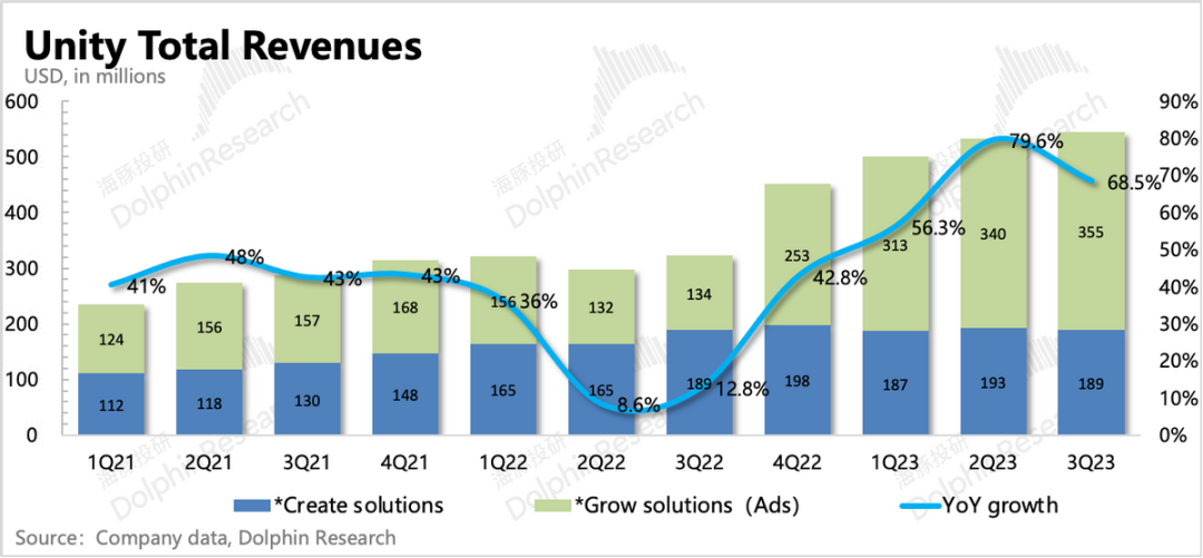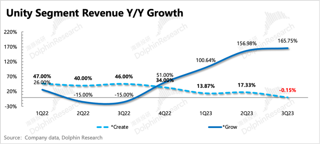 不过随着游戏广告市场的发展,公司旗下的运营解决方案业务(Grow)收入稳步增长,甚至超过了以引擎为主的创作解决方案业务(Create)的收入贡献。如今,Grow营收甚至已经占到了Unity总收入的三分之二。