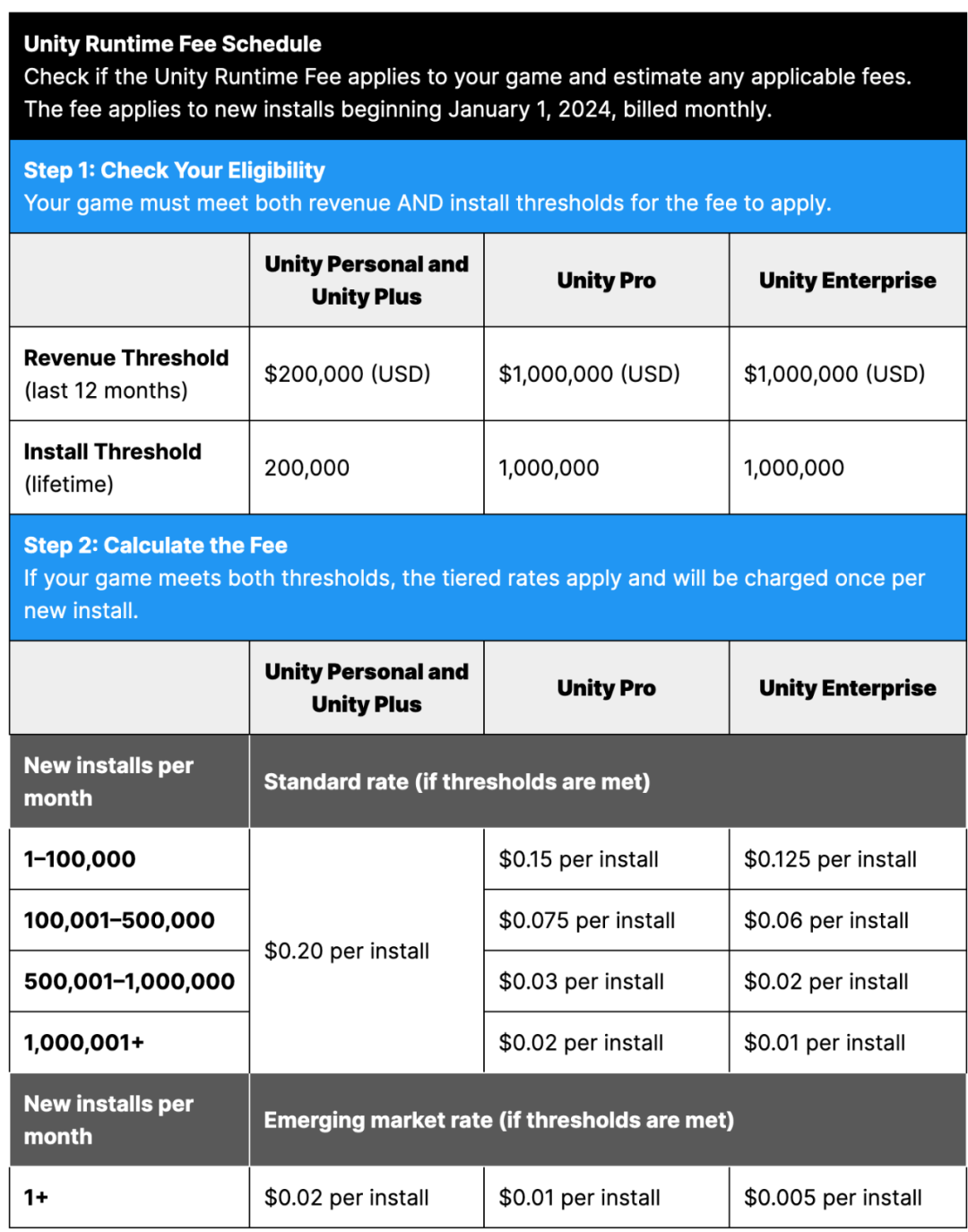 随即,Unity公开了更改后的运行时费政策运行规则,规则中强调使用Unity Personal 、过去 12 个月收入低于 100 万美元或者使用2024年之前发布的老版本Unity开发的游戏无需支付 Runtime 费用;对于需要支付Runtime费用的游戏,开发者可自行选择通过2.5%的收入分成或根据每月新用户数量(两者取较小)计算。