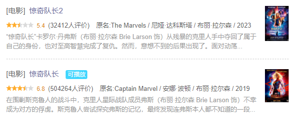 目前《惊奇队长2》北美烂番茄在62%,处于漫威最差的梯队中。内地方面,豆瓣,目前保持在5.4分。而更离谱的是,影片在猫眼仅有6.8,淘票票仅为6.5,要知道于购票平台来说,低于9分都属于不及格,《惊奇队长2》6分+的数据,完全属于年度最烂的范畴。