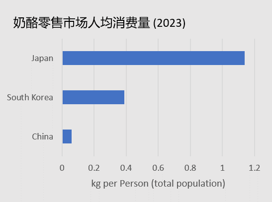 另一个数据显示,与饮食习惯相近的日韩相比,我国奶酪零售市场人均销量较低。2023年,中国的人均奶酪消费量只有大概不到0.1千克,但是与我们消费习惯接近的日韩大概是在1.12千克和0.4千克,在这背后蕴藏着中国市场巨大的成长空间。