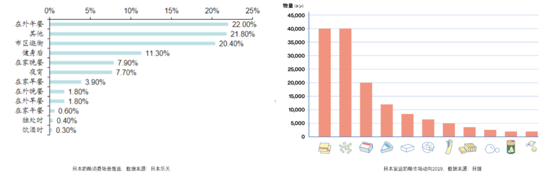 以日本市场为例,日本零售奶酪的消费场景非常细分,涵盖了时间和空间的各个方面,大概十几个场景。产品类型也极具多样性,从常见的奶酪片、奶酪碎,到各种形态的奶酪块及奶酪零食,满足了不同的消费者需求。其中,外用午餐、其他和市区逛街是日本奶酪消费的典型场景,它们的核心占比超过了六成。在产品类型上,奶酪片和奶酪碎的销量最高,其次是各种形态的奶酪块。