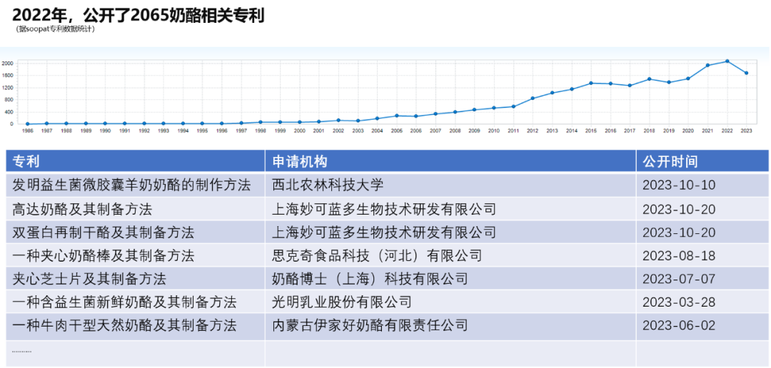 2022年,有2065个奶酪相关专利在我国公开,其中,不乏伊利、光明、妙可蓝多、奶酪博士等品牌的身影。