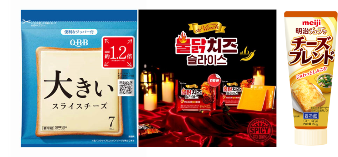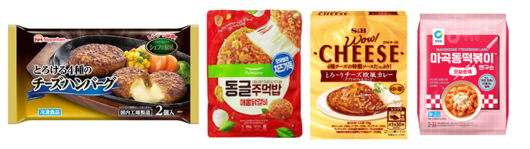 除此之外,将奶酪与本土料理结合也是一个值得思考的方向,由此提高消费者对奶酪的接受程度和食用频率。在日韩市场,我们发现了许多奶酪与米饭、年糕、包子、肉饼、咖喱等结合的产品案例。