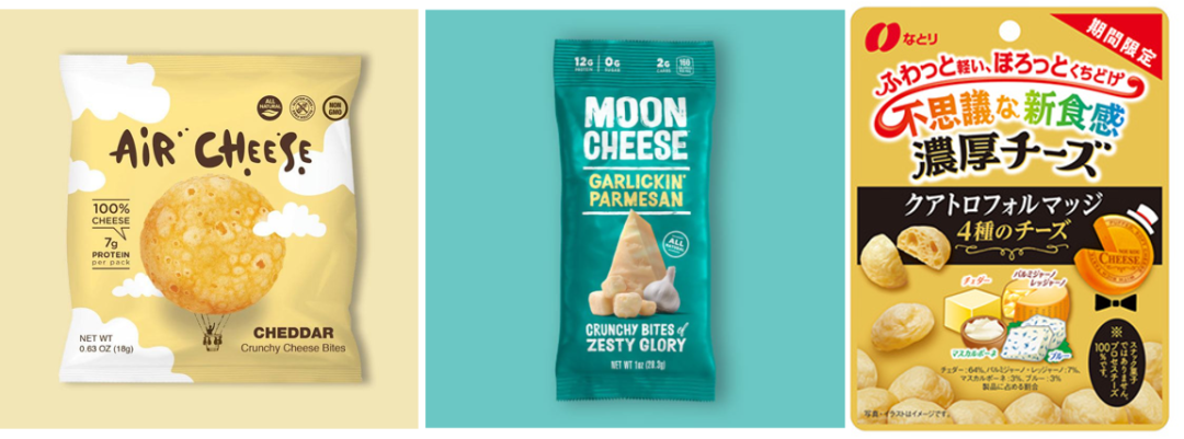另一个机会品类是零食形态的奶酪脆,因为除去水分,所以蛋白含量非常高,同时常温储存,免去了低温贮藏的麻烦,另外在口味口感、造型以及消费场景等方面具有很强的可塑性,比如说,可以空口作为零食吃,也可以作为小料加入麦片、酸奶里,还能拌入沙拉或者汤里。