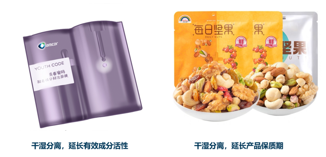 第二,不同消费领域的包装是互通的,包装的跨界创新可以给产品带来新的灵感。比如在面膜领域应用的干湿分离包装,可以用到零食品类,每日坚果零食,就是通过干湿分离的设计达到了延长保质期的效果。这两款包装虽然是应用于不同领域的两款产品,但都是采用了分区的模式来达到保鲜保质的目的,这就是包装的跨界创新。