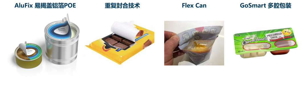 接下来是便利生活的包装,现在人们的生活节奏越来越快,便于使用的包装能够为消费者腾出时间、精力和空间。首先分享的是POE金属易揭盖膜,盖子相比传统易拉盖更容易开启,而且更加安全。衍生到奶酪品类,可以用于涂抹奶酪、奶酪饼干等包装。