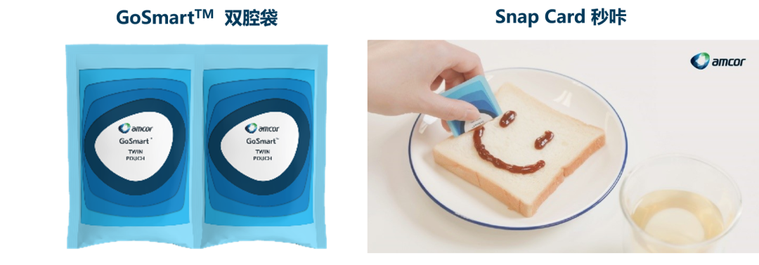 另一个是GoSmart 多腔包装,每个独立腔室都有易于揭开的盖膜。多种口味或形式可以组合在一起,易于消费者开启、食用、丢弃。它的应用范围非常广泛,从大份量的能量餐到小份的零食包都能适用。这种包装不仅仅是一个容器,它本身就变成了一个餐具。
