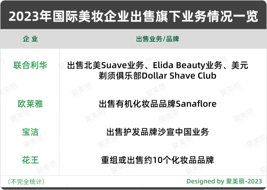 据聚美丽不完全统计,今年以来,包含联合利华、欧莱雅等多家国际知名集团皆有出售子业务的举动。