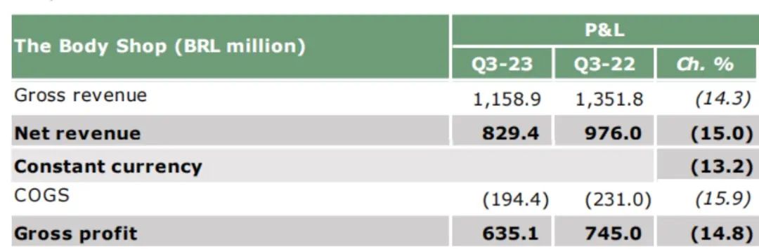 据圣保罗时间11月13日Natura&Co发布的最新财报数据显示,今年第三季度,The Body Shop净收入为8.29亿雷亚尔(约合人民币12.36亿元),同比下滑15.0%,按固定汇率计算下滑13.2%;前9个月,The Body Shop净收入为24.80亿雷亚尔(约合人民币195.69亿元),同比下滑14.6%,按固定汇率计算下滑11.7%。