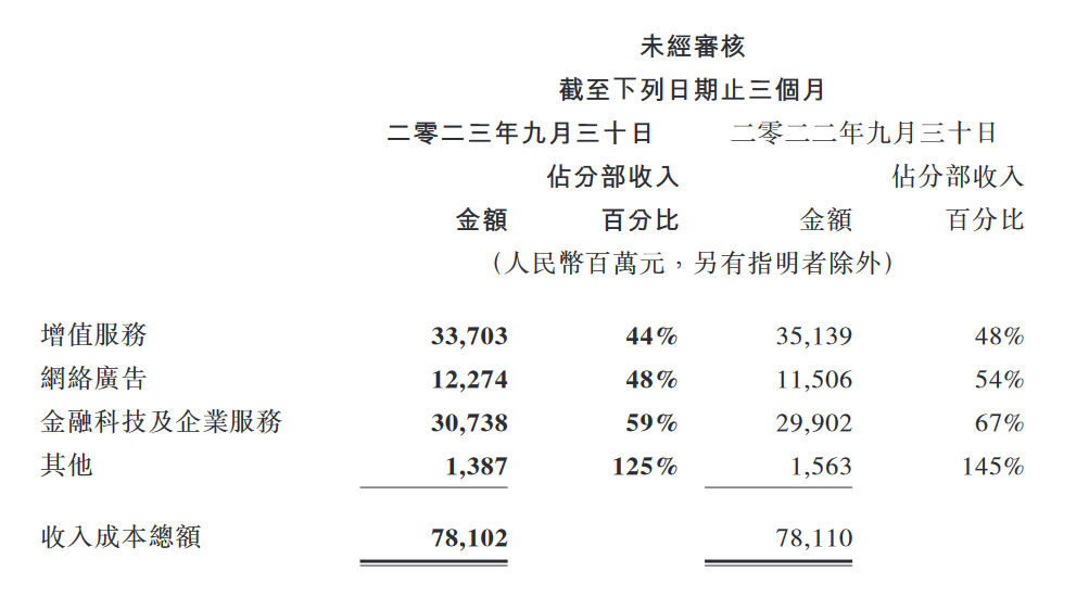 这与降本增效的推行密切相关。腾讯收入成本为781亿元,在总收入中的占比为51%,较去年同期下降了5个百分点。增值服务、网络广告业务的收入成本分别下降了1%、4%。此外,销售及市场推广开支环比继续下降5%,达79.1亿元。