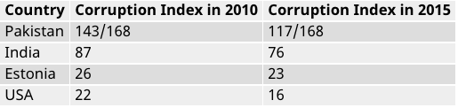 尽管过去五年取得了一些进步,巴基斯坦仍然在透明国际(Transparency International)编制的腐败指数上排在前列。而腐败和任人唯亲将导致大规模政府赤字和经常账户逆差,限制竞争和技术的进步。
