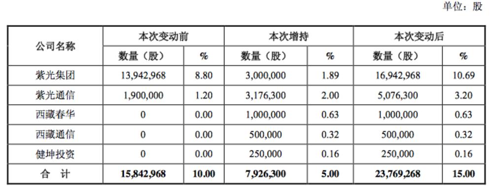 此次权益变动前,紫光集团持有中发科技1394.30万股股份,占公司全部已发行股票数量的8.80%;紫光通信持有中发科技190.00万股股份,占公司已发行股票数量的1.20%。交易完成后,紫光集团及其上述一致行动人共持有中发科技2376.93万股股份,占公司已发行股票数量的15.00%。具体变动情况如下: