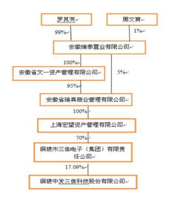 6月3日,*ST中发公告称,瑞真商业以现金出资1.5亿元,受让安徽国购机器人产业控股有限公司持有的上海宏望资产管理有限公司100%股权,从而通过*ST中发的控股股东铜陵市三佳电子(集团)有限责任公司,间接控制上市公司17.09%股权。上述股权转让行为导致公司实际控制人由袁启宏变更为罗其芳和周文育(二人系一致行动人关系)。变更后的股权结构如下:
