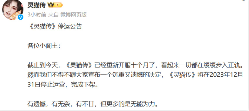 但能苟着已算胜利,更多国乙倒在了2023。2月《掌门很忙》宣布停止内容更新,6月《无法触碰的掌心》因授权合约到期停运,9月原本已拿到版号的《钟之镜》宣布暂停开发,10月曾停服又复活的《灵猫传》再度宣布年底停运,10月底上线仅6个月的《花间绘君颜》宣布年底停运……