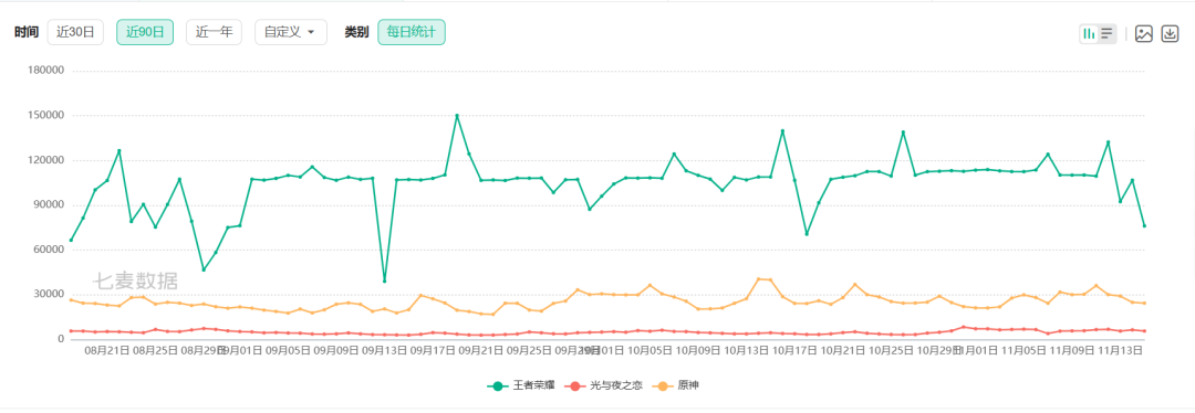 对比近3个月四大国乙的收入曲线,以及最能打的《光夜》与《王者》《原神》的收入比对,国乙吸金力的下滑更加明显。