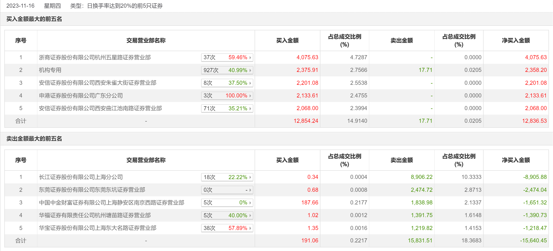 具体来看,机构买入2375.91万元,卖出17.71万元,合计净买入2358.2万元。此外,浙商证券杭州五星路证券营业部、安信证券西安朱雀大街证券营业部分别买入4075.63万元、2201.08万元;长江证券上海分公司、东莞证券东莞东坑证券营业部分别卖出8906.22万元、2474.72万元。