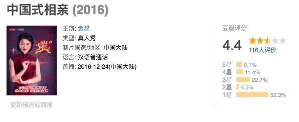 周末的时候陪爸爸妈妈在家看电视,看到一档节目叫做《中国式相亲》,金星主持的,东方卫视的节目。这一期节目把上海的人民公园相亲角搬上了银幕,成为了一个如假包换的“包办婚姻”。金星在一出场说起节目的口号就让人大跌眼镜“一人脱单,全家光荣,有爸妈更放心。”