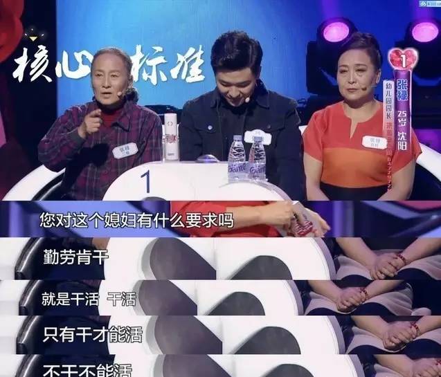 首先一出场,一个男生的二姨就不停的要求女孩子身体健康,心地善良,勤劳肯干,当家理财,最后最重要的是还得会做家务,不停地干活。