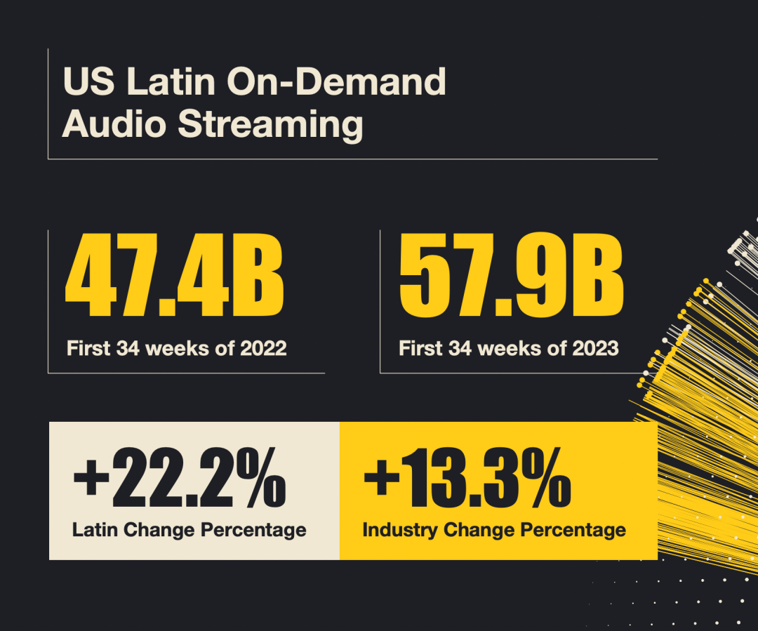 时隔一年,拉丁音乐的势头不减。根据Luminate的一份报告显示,在2023年的前34周,拉丁音乐流在美国同比激增22%,接近580亿次播放量,2022年同期,这一数字为474亿次。