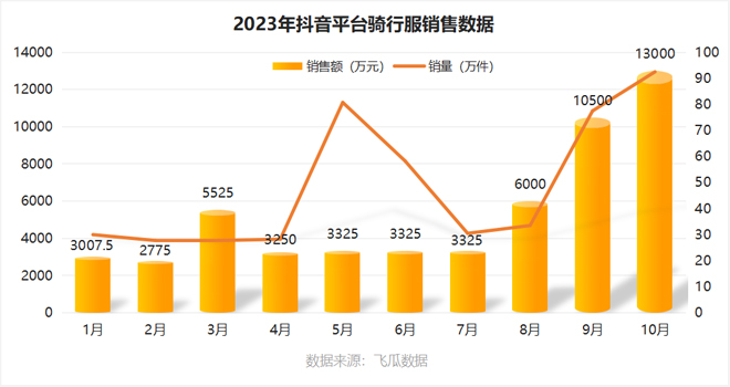 在年轻人的聚集的社交媒体-抖音平台上,今年1-10月,骑行服的销量及销售额总体呈上涨趋势,其中销量峰值集中在夏季及秋季;10月销售额最高达到13000万件,十分可观。