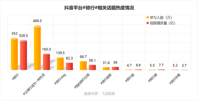 抖音平台上[骑行]相关话题热度轻松过亿。其中,#骑行 话题参与人数达352万,视频播放量达328.5亿;#骑行装备 话题参与人数31.6万,视频播放量36亿,也是不容小觑的数据。