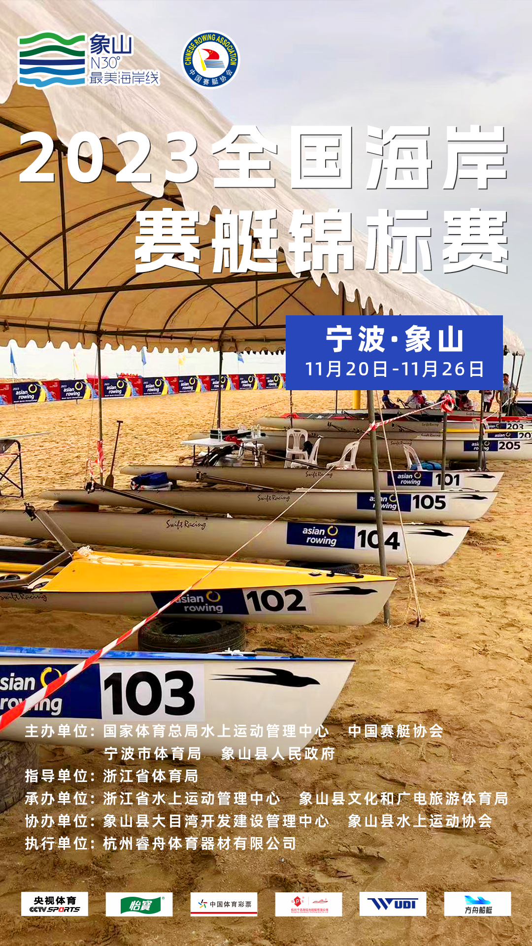 11月20日至26日,2023全国海岸赛艇锦标赛将在宁波市象山县松兰山海滨东沙滩(浙江省帆船训练基地)举行,来自全国14个省近200名优秀运动员、教练员将在象山北纬30度最美海岸线上演海陆版“速度与激情”。