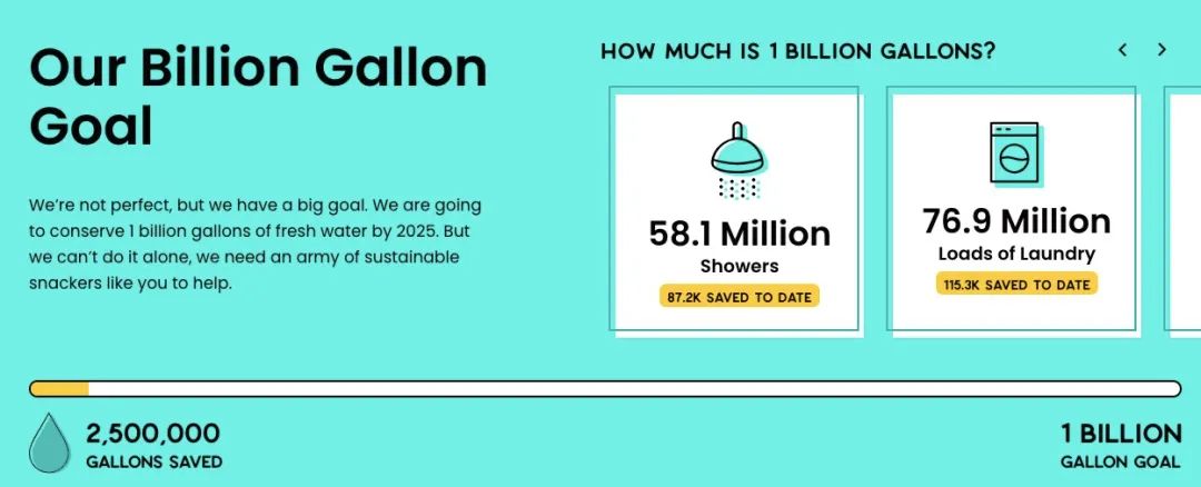 Kazoo Snacks还在其官网公布目标,希望到2025年能节约10亿加仑水,并呼吁支持可持续发展的消费者参与。品牌还通过一系列日常用水量的对比,帮助用户理解节约10亿加仑水将带来的显著环境影响。