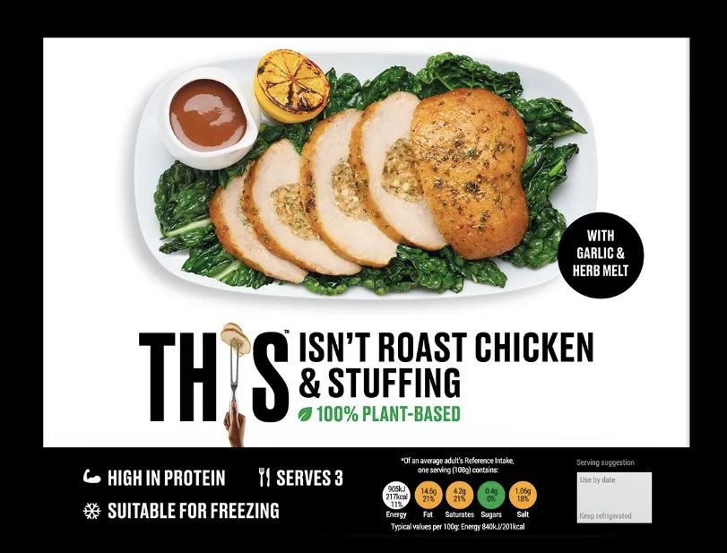 例如,“周日烤肉”是英国的传统美食,来自英国的THIS公司为这道国民菜肴制作了100%素食烤鸡,带有蒜香草本风味。品牌表示该产品是适合肉类爱好者的植物基食品,在味道、质地、外观等方面都非常接近真实的肉类。