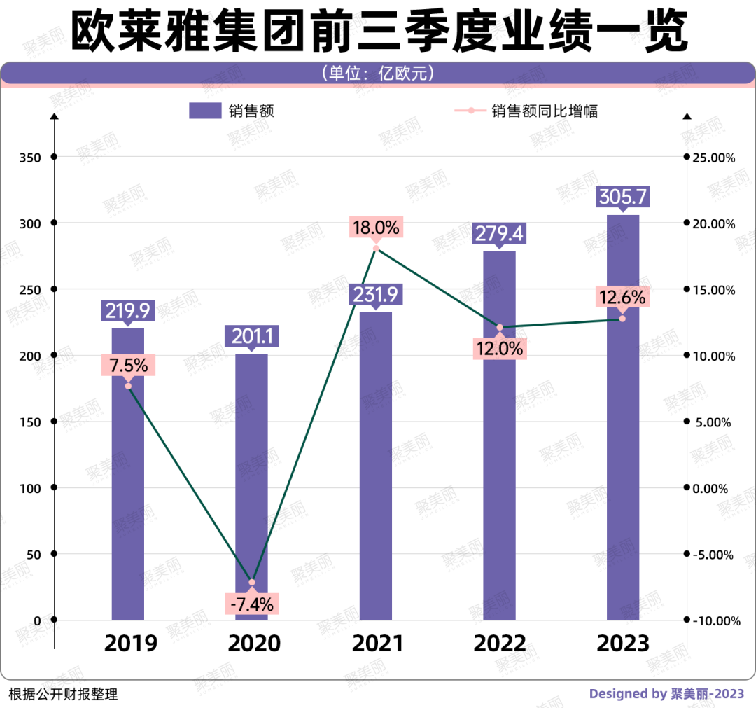 据欧莱雅财报显示,今年前三季度欧莱雅实现营收305.77亿欧元(约合人民币2380.55亿元),同比增长12.6%。据悉,自2020年遭受疫情导致营收下滑后,欧莱雅近三年来都在保持高速增长,而今年三季度是其首次前三季度突破300亿欧元。
