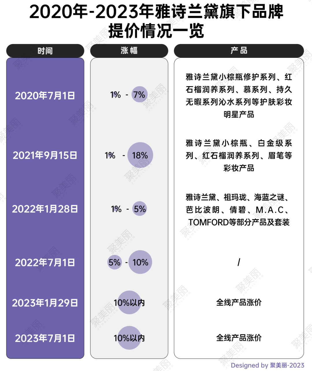 而不同于上述两家企业将涨价写在财报中,近年来雅诗兰黛在财报虽并未过多提及涨价,但从实际运营来看,涨价策略其也是一直身体力行。据聚美丽不完全统计,自2020年至今雅诗兰黛已有6次涨价,多数涨价主要集中在10%以内,最高的是2021年9月白金系列精华水价格上调了17.3%。