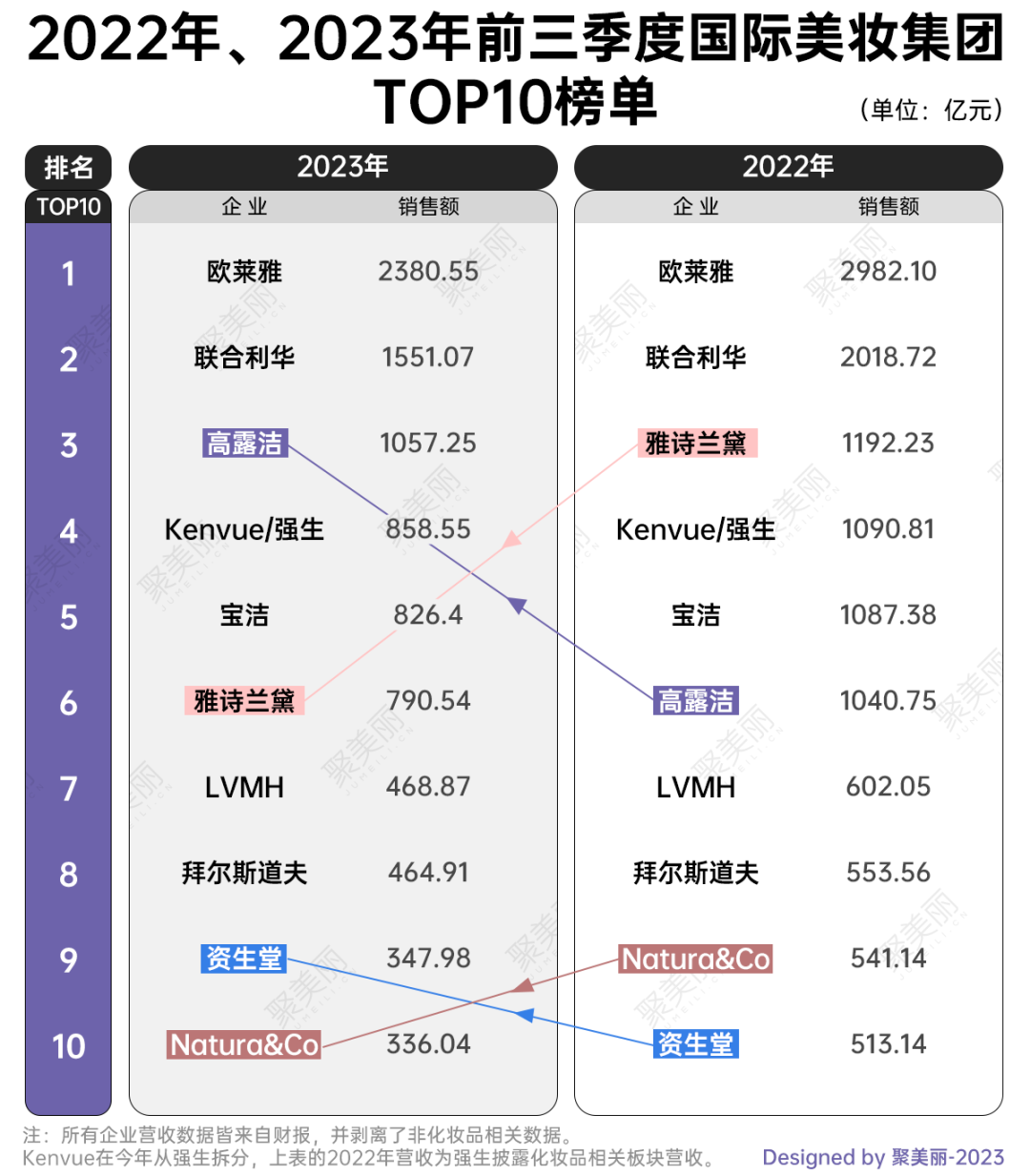 随着巴西化妆品巨头Natura&CO 发布三季报,2023年国际美妆企业TOP10前三季度业绩已全部公布,全球十大化妆品公司的最新排行也随之出炉。