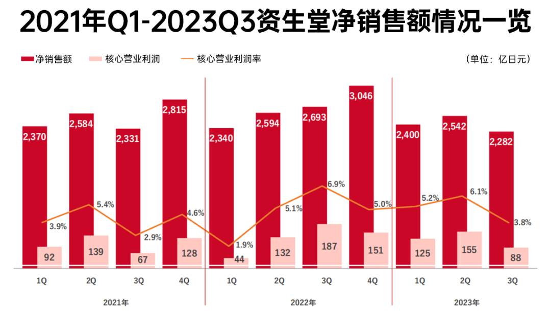 其中,第三季度资生堂的净销售额和核心经营利润更是出现双降:净销售额同比下滑15.3%,为2282亿日元(约合人民币109.92亿元),核心经营利润同比大跌52.9%,为88亿日元(约合人民币4.24亿元)。