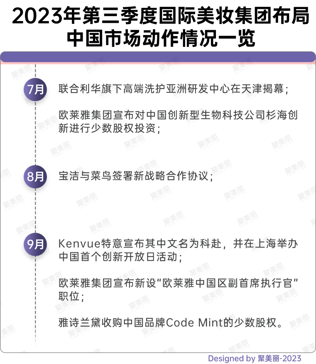 7月,联合利华旗下高端洗护亚洲研发中心在天津揭幕,欧莱雅集团宣布对中国创新型生物科技公司杉海创新进行少数股权投资;8月,宝洁与菜鸟签署新战略合作协议,未来双方将深化渠道合作,聚焦打造数智绿色供应链;9月,Kenvue特意宣布了其中文名为科赴,并在上海举办中国首个创新开放日活动,欧莱雅集团宣布新设“欧莱雅中国区副首席执行官”职位,雅诗兰黛收购了中国品牌Code Mint的少数股权。