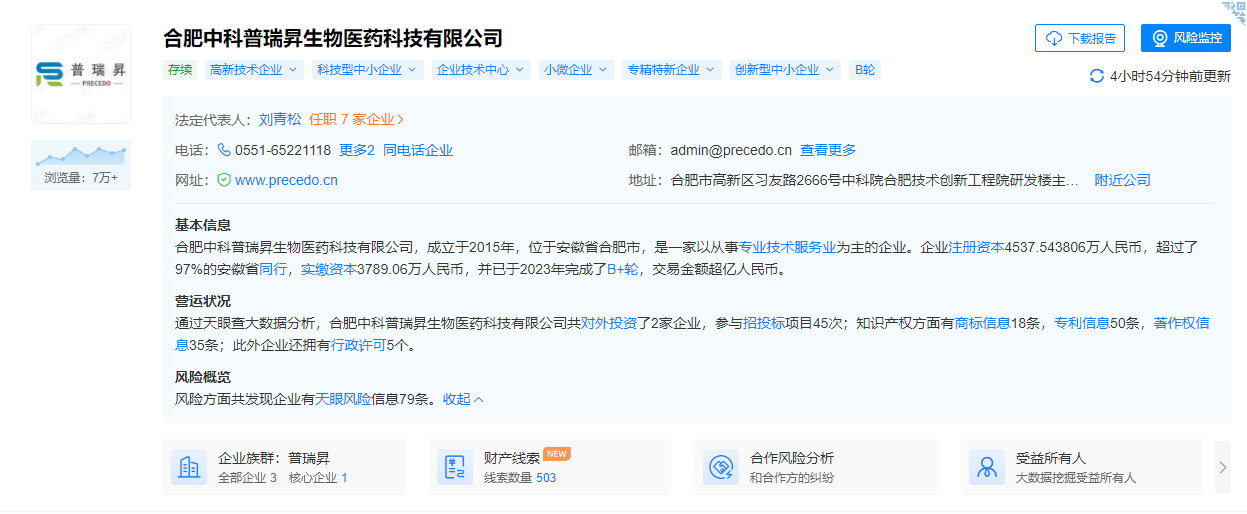 天眼查APP及企业官网显示,合肥中科普瑞昇是依托中国科学院合肥物质科学研究院研究力量,于2015年在安徽省合肥市注册成立的一家国有产业资本支持的高新技术企业。企业注册资本4537.543806万人民币,超过了97%的安徽省同行,实缴资本3789.06万人民币。