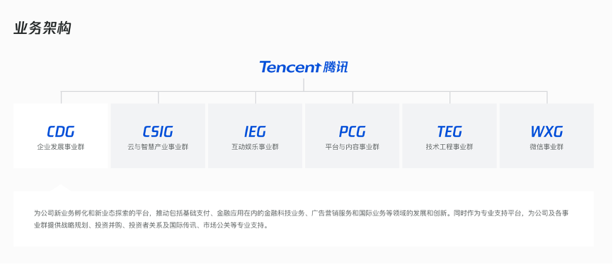 固然,腾讯也有自己的擅长,比如企微目前来看是表现好于飞书的,腾讯游戏业务也是字节一直追不上的,按照腾讯当下的事业群分类,只有PCG,这个和字节高度对抗的事业部,处于弱势。