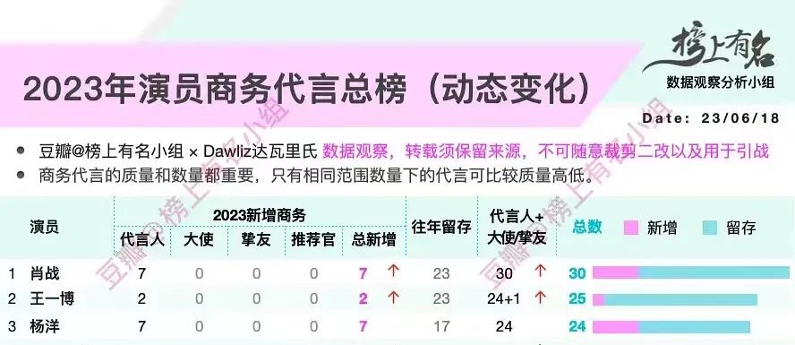 (2023年演员商务代言总榜(0618版,部分)图源:豆瓣@榜上有名小组)