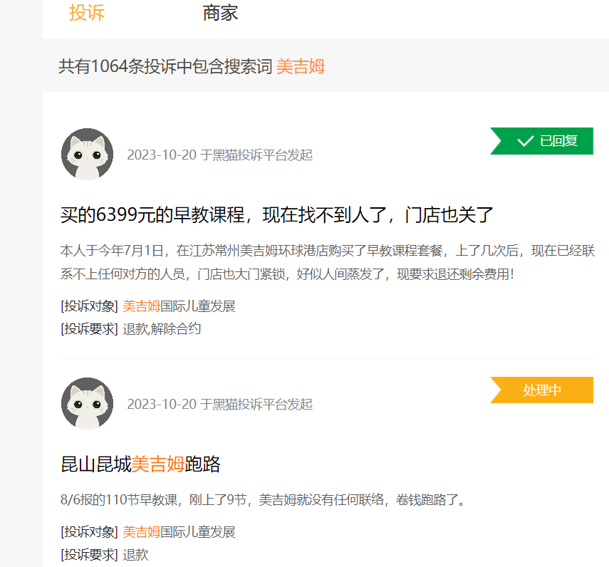 在黑猫投诉平台上检索关键词,和美吉姆相关的内容多达1064条结果。