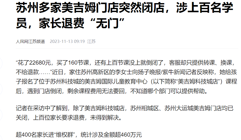 目前,美吉姆在北京、上海、广州、杭州、成都等地均有多家门店关闭,家长退费困难。