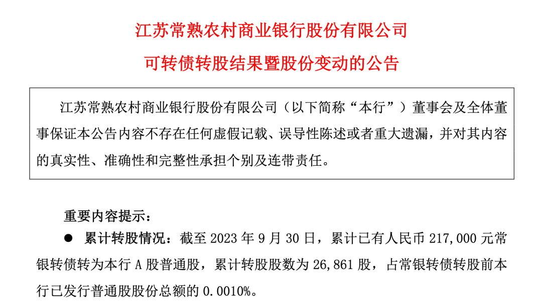 值得一提的是,2022年9月,常熟银行发行了一笔为期6年总额60亿元的可转债。据公告显示,截至2023年9月30日,累计已有21.7万元常银转债转为本行 A 股普通股,累计转股股数约为2.69万股,占已发行普通股股份总额的0.001%。尚未转股的常银转债金额约为59.998万元,占发行总量的比例99.9964%。