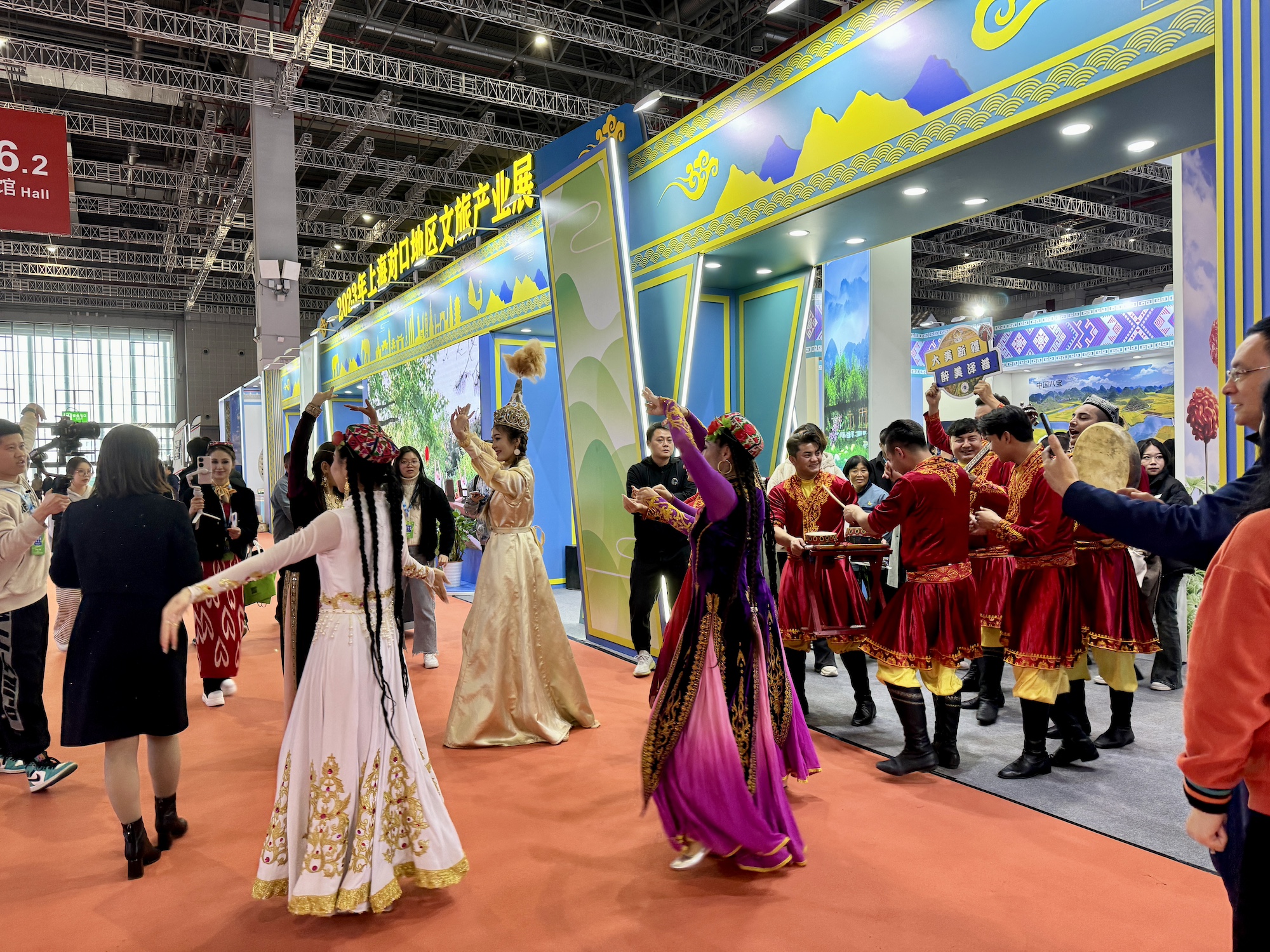 本届文博会,最为热闹的当属新疆喀什展区。少年少女们穿着少数民族服装载歌载舞,表演非物质文化遗产、传统歌舞艺术十二木卡姆、叶城赛乃姆以及麦西热甫,点燃了展馆气氛。