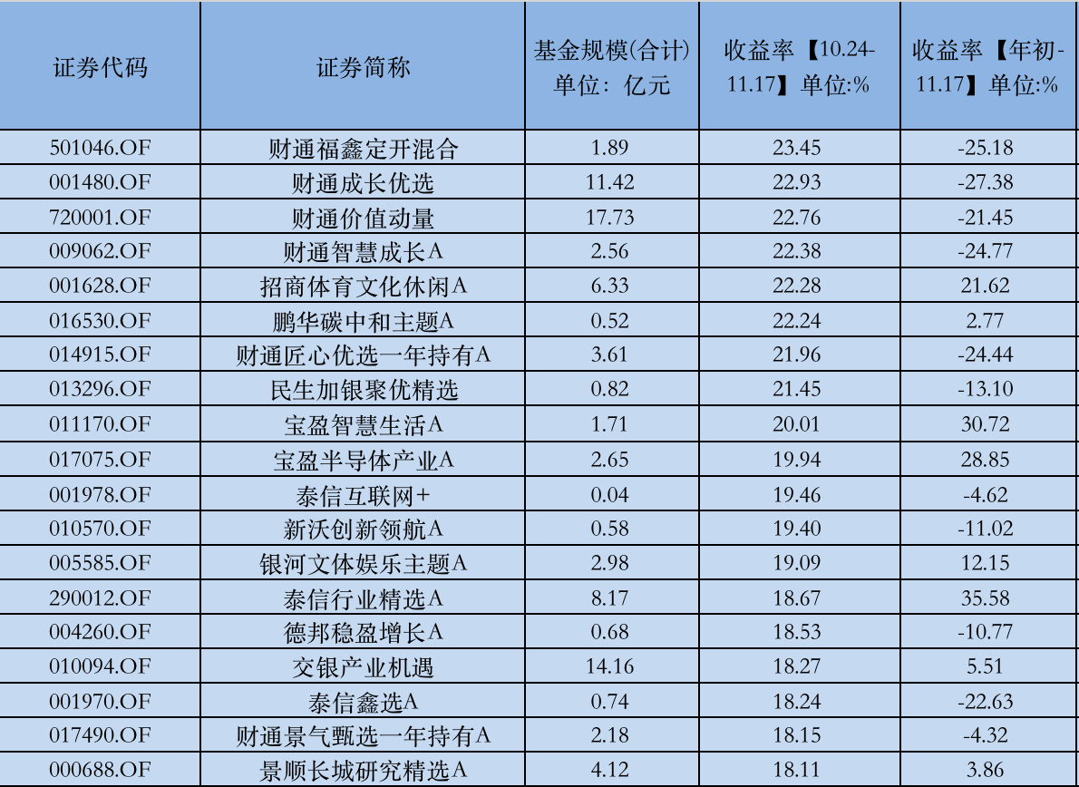 界面新闻记者筛选出全市场主动权益型基金(普通股票型、灵活配置型、平衡混合型、偏股混合型),10月24日至11月17日期间,超95%的主动权益基金净值实现增长,474只基金净值增长超10%。此外,另有近一成收益为负的基金收益转正。