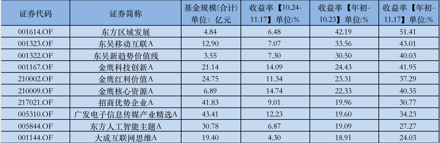 年内业绩靠前的基金,在这波回弹中,业绩也乘势而上。其中,金鹰基金陈颖管理的金鹰科技创新、金鹰红利价值、金鹰核心资源这波涨幅超10%。此外,还有冯骋管理的广发电子信息传媒产业精选这波上涨了12.23%。