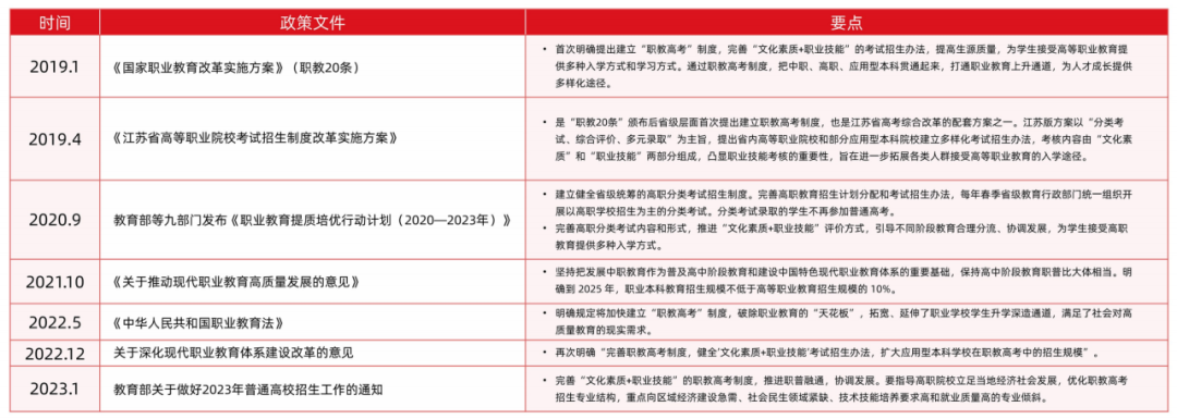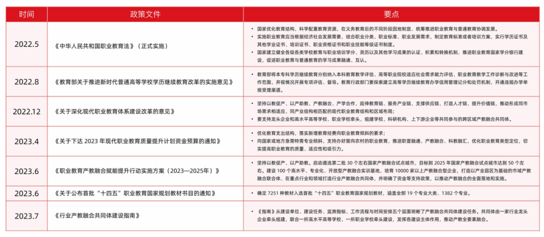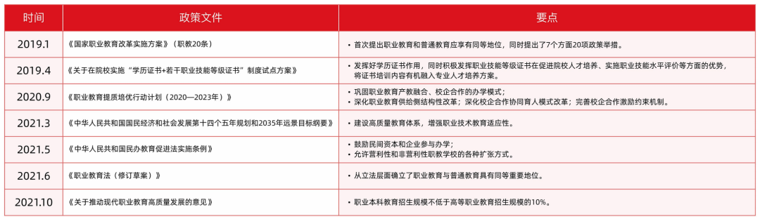 首先聚焦学历职业教育层面的发展走向,主要是探索建立「职教高考」制度,「产教融合」成职业教育发展必由之路,从顶层设计到制度标准,构建了一整套贯穿学生入口到出口、具有中国特色的现代职业教育制度体系。
