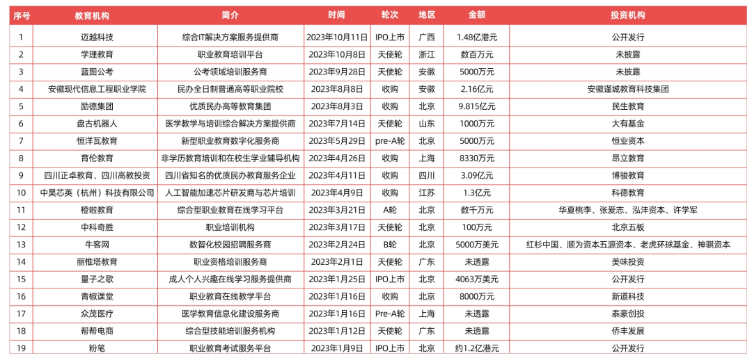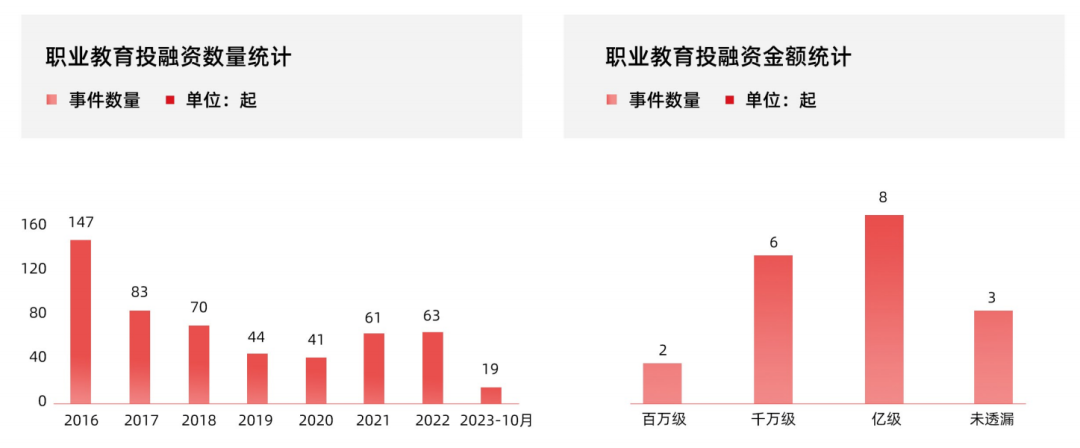 2023 年,截止10月份,职业培训市场发生了 19 起投融资事件,其中根据投融资金额统计,千万级投融资共6起,亿级的达到8起。职业教育获资本市场青睐,投资风向聚焦并购与行业整合。