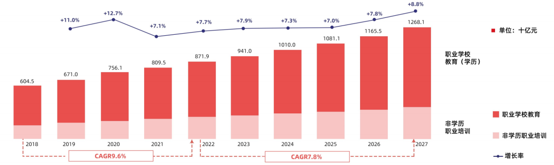 近日,多鲸教育研究院《2023 职业教育行业发展趋势报告》出品。报告显示,经多鲸教育研究院预测,预计未来中国职业教育市场将于2024年突破万亿规模,并于2027年达到12,681亿元。