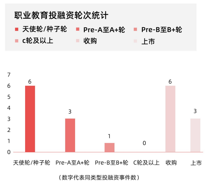 投融资轮次情况中,早期项目为主导,天使轮到 A 轮的投融资事件较多,共 6 起,占比 31.57 %。战略投融资比重加大,行业整合并购加速,小而美的职业教育垂类公司成为并购目标。预计,随着职业教育政策的逐步明朗化,产业端会出现更多的投资交易。
