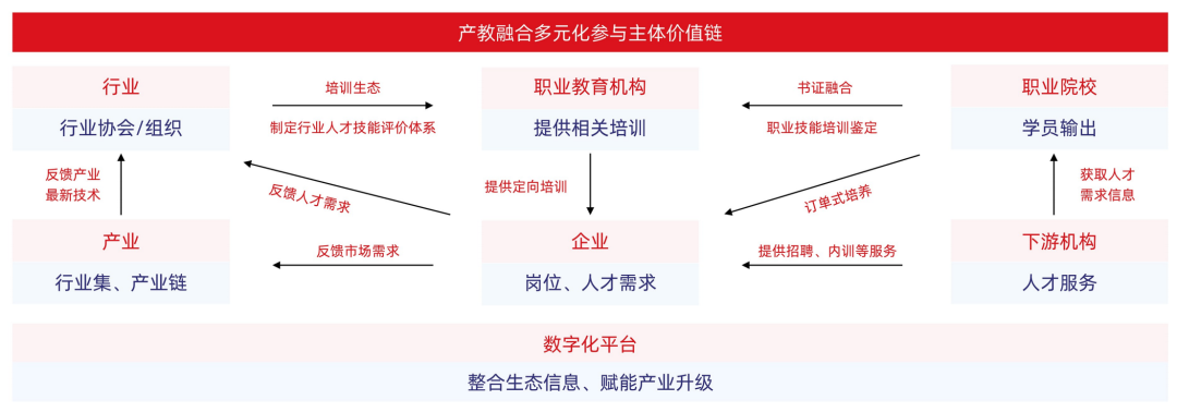 在深入推进产教融合落地中,职业教育要实行政府统筹、分级管理、地方为主、行业指导、校企合作、社会参与。其中,产教融合涉及多个参与主体,包括政府、学校、行业产业、企业、协会等,各主体在产教融合中担任不同角色并发挥关键性作用,还要充分发挥各主体在产教融合中的重要角色,使学校和企业双方在共同的目标和利益驱动下,将人才培养、科学研究、技术创新、产业升级等有机地结合在一起,形成一种深度融合的合作关系。