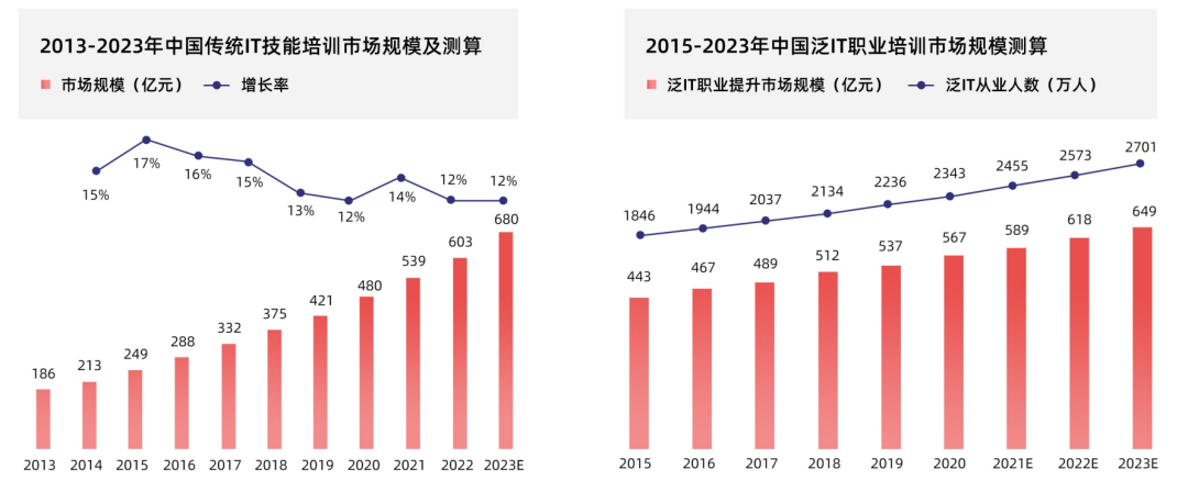 在IT培训领域,据预测, 2023 年传统 IT 技能培训市场规模达 680 亿,泛 IT 职业培训市场规模约为 649 亿元,两者合计超千亿元,成为职业教育行业的重要组成部分。而随着产业升级和数字化转型,IT 行业高速发展,会进一步强化IT 培训的需求性。