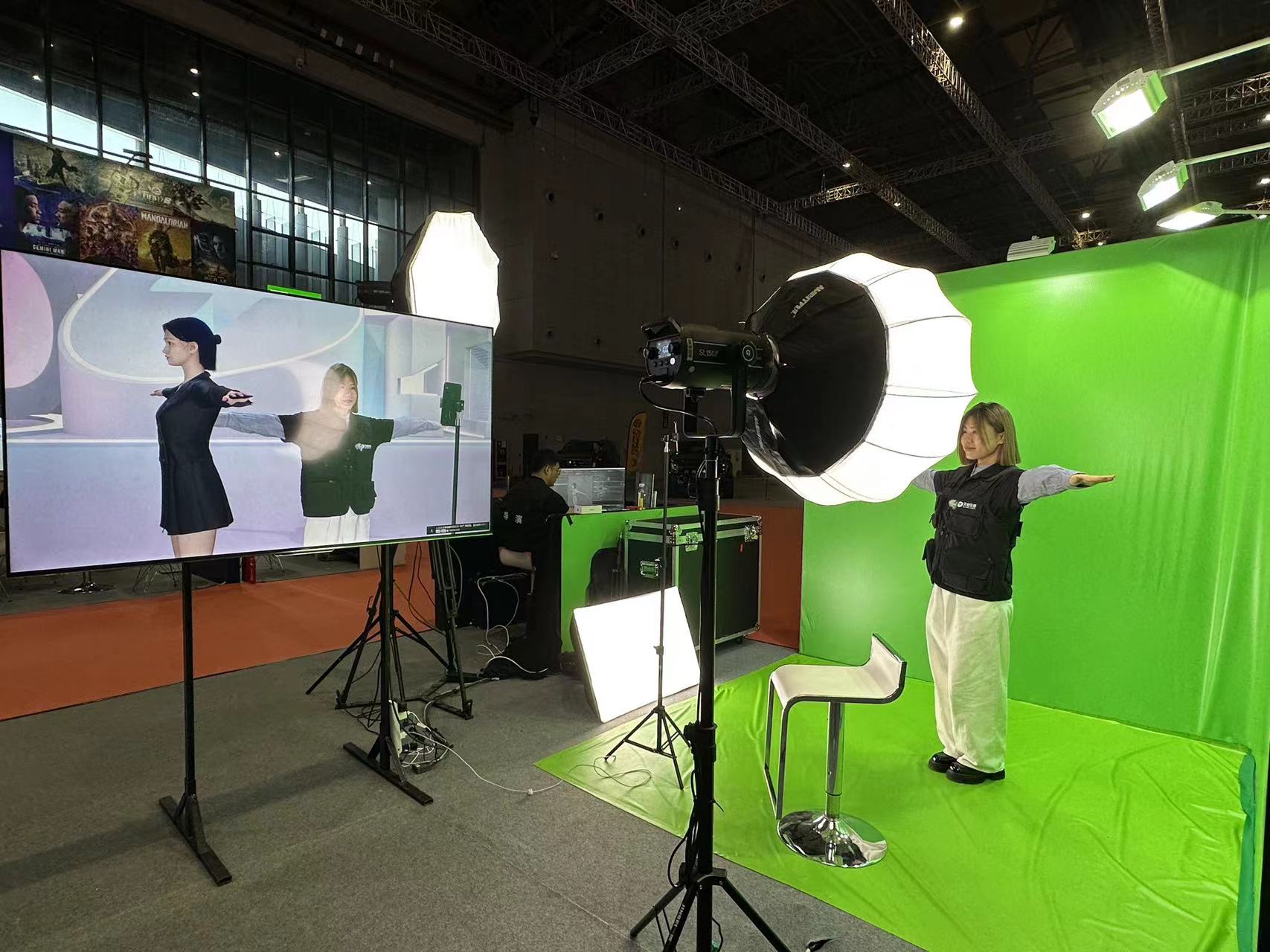 北京全时天地在线网络信息股份有限公司(下称“天地在线”)则在展台现场搭建了一块绿幕,实时通过电脑创造“数字人”影像。
