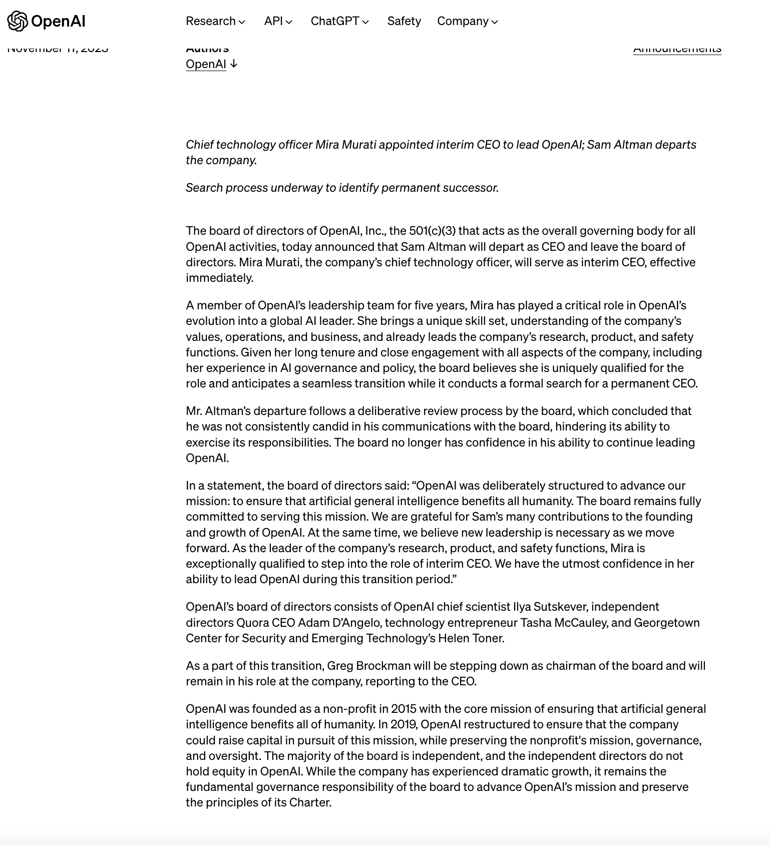 太突然!北京时间 11 月 18 日凌晨,OpenAI 官网一纸公告,炸裂整个 AI 圈。我们先看公告全文: